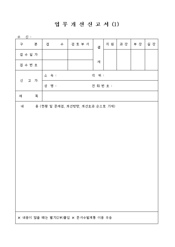 9,000원/월현재 진행하고 있는 업무에 대한 현황, 문제점, 개선방향, 개선효과 등을 기입하여 업무개선을 도모하고자 할때 작성하는 업무개선 신고서 양식입니다.
