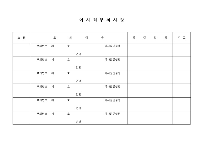 9,000원/월이사회부의사항에 대한 토의 내용과 의결결과를 기록하는 양식입니다.