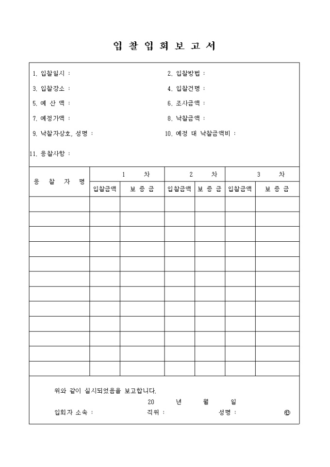 9,000원/월입찰입회를 일시, 방법, 장소, 입찰건명, 예산액, 조사금액등을 기재하여 보고하는 양식입니다.
