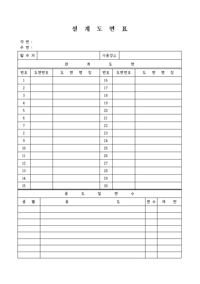 9,000원/월설계도면표 양식입니다. 도면별 도면번호와 도명명칭으로 구성된 양식입니다.