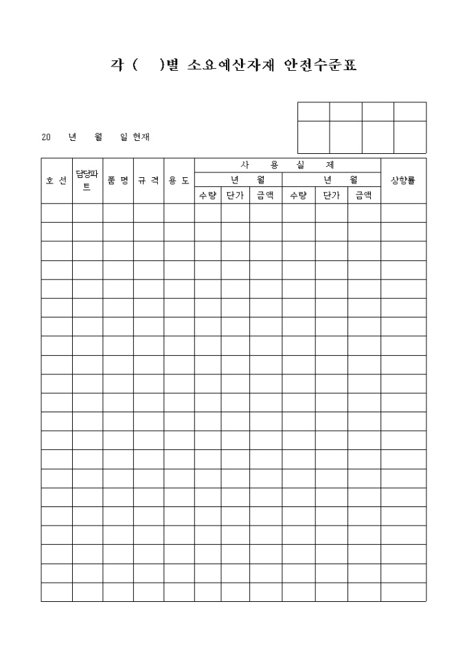 9,000원/월소요 예산자재의 용도별 사용실제량과 금액을 기록하여 안전수준을 파악하는 예산자재 안전수준표입니다
