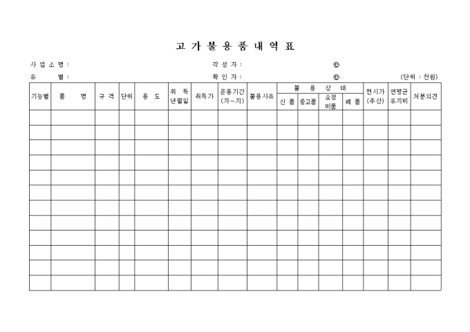 9,000원/월물품의 불용내역을 품명, 규격, 단위, 용도, 운용기간등으로 정리하여 관리하는 표 양식입니다.