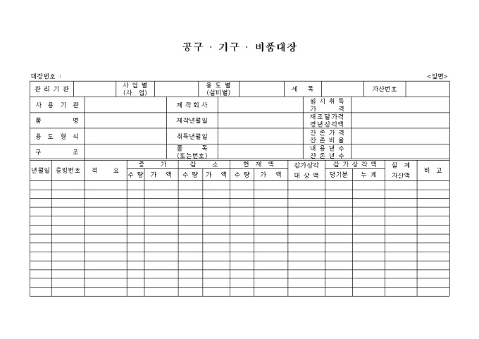 9,000원/월공구. 기구. 비품의 증가,감소,현재액별 수량,가액과 감가상각 대상액 등을 기록하는 양식입니다.