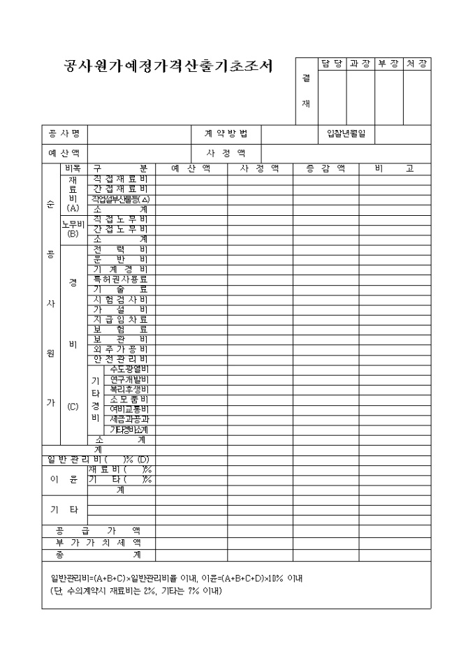 9,000원/월공사원가예정가격의 산출을 위한 기초내역의 조서 양식입니다. 순공사원가와 일반관리비, 이윤, 공급가액, 부가가치세액에 대한 내용으로 구성되어 있습니다.