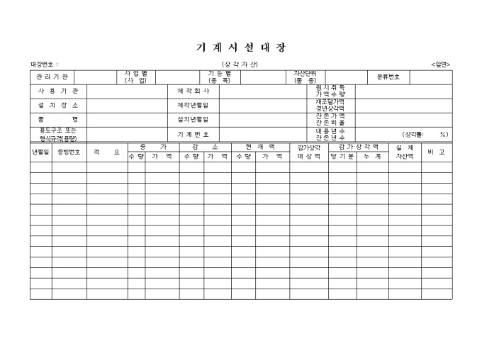 9,000원/월기계시설에 대한 사둉처, 장소, 품명, 용도, 비용등을 정리한 기계시설대장 양식입니다.