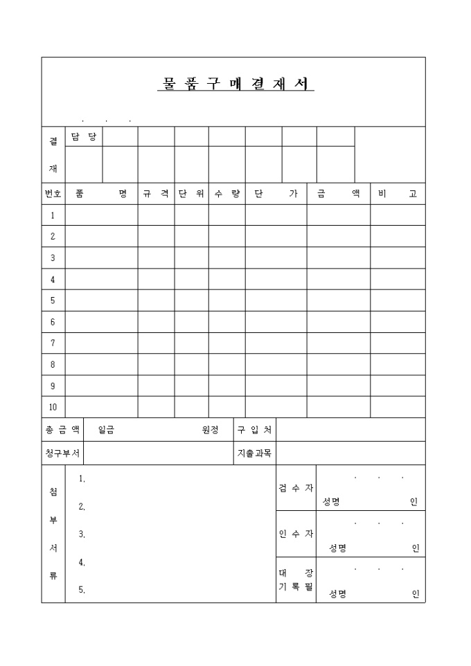 9,000원/월물품구매결재서 양식입니다. 품명, 규격, 단위, 수량, 단가, 금액등으로 구성된 결재서 양식입니다.