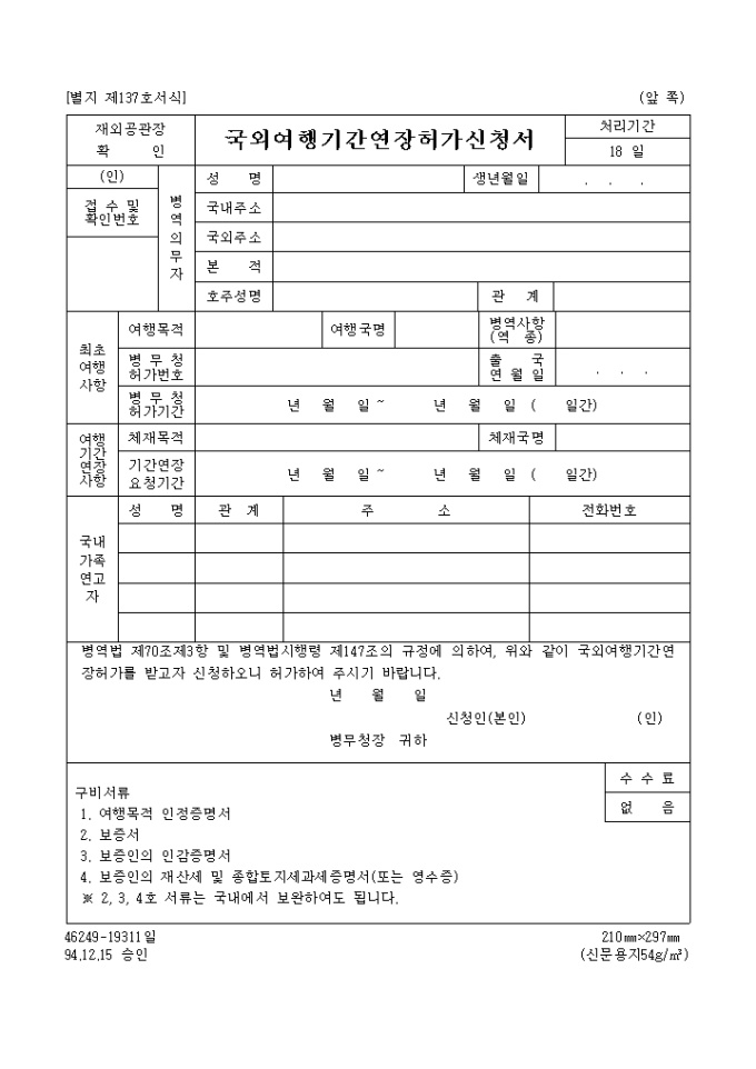 9,000원/월국외 여행기간 연장 허가신청서 양식 예제입니다. 병역법 제70조제3항 및 병역법시행령 제147조의 규정에 의하여 , 위와 같이 국외여행기간연장허가를 받고자 신청하오니 허가하여 주시기 바랍니다. 년 월 일 신청인(본인) (인) 병무청장 귀하