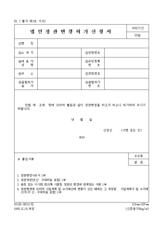 9,000원/월법인 정관 변경 허가신청서 양식 예제입니다. 민법 제 조제 항에 의하여 별첨과 같이 정관변경을 하고자 하오니 허가하여 주시기 바랍니다. 년 월 일 신청인 (서명 또는 인) 귀하