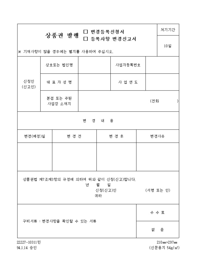 9,000원/월상품권 발행(변경등록신청서,등록사항변경신고서) 양식입니다. 상품권법 제7조제3항의 규정에 의하여 위와 같이 신청(신고)합니다. 년 월 일 신청(신고)인 (서명 또는 인) 귀하