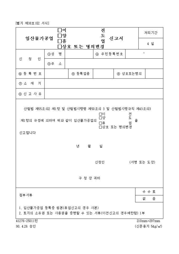9,000원/월산림법 제55조의2 제1항 및 산림법시행령 제50조의 3 및 산림법시행규칙 제43조의3 제1항의 규정에 의하여 위와 같이 임산물가공업의 (이전, 양도, 휴업, 상호 또는 명의변경)을 신고할 때 사용하는 '임산물 가공업(이전,양도,휴업,상호 또는 명의변경)신고서' 양식입니다.