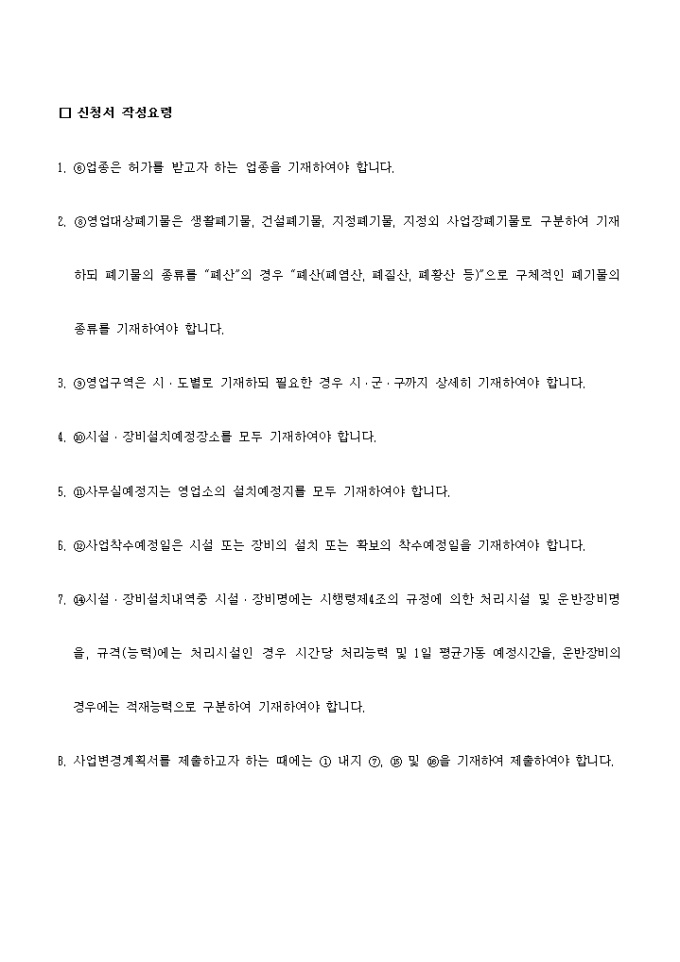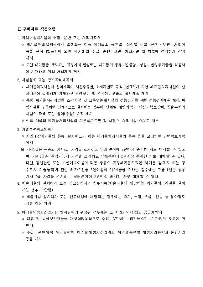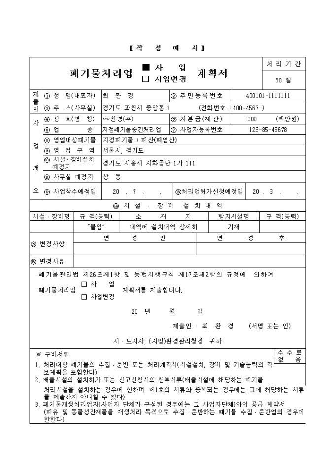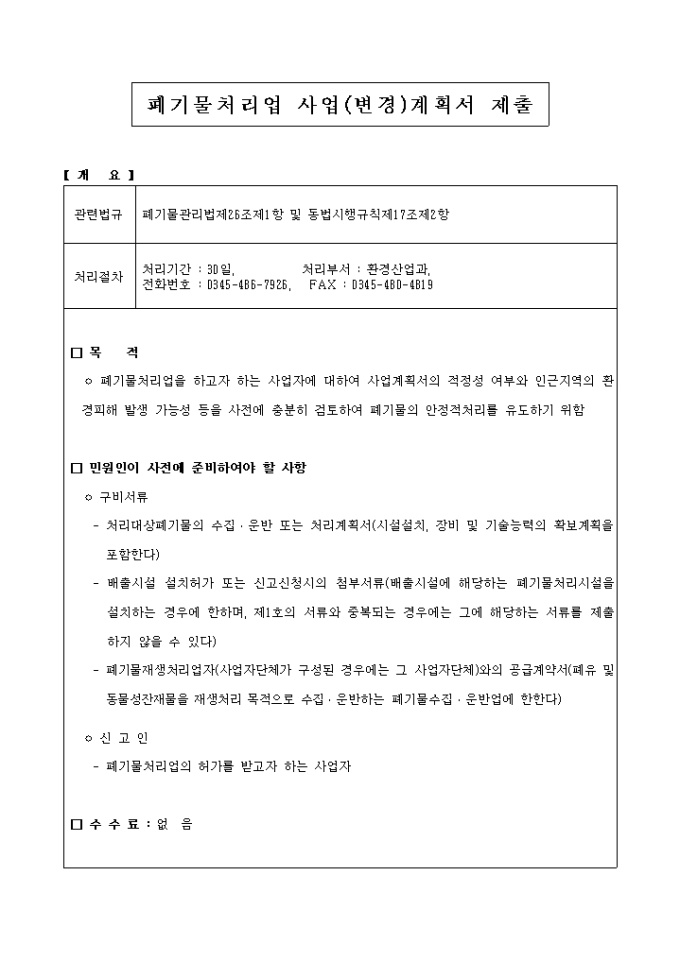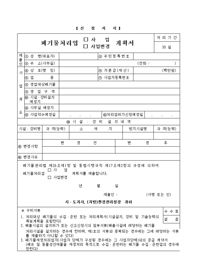 9,000원/월폐기물관리법-폐기물처리업사업(변경)계획서제출 입니다. 폐기물관리법 제26조제1항 및 동법시행규칙 제17조제2항의 규정에 의하여 폐기물처리업 (□ 사 업/□ 사업변경)계획서를 제출 하실때 사용하는 양식입니다.