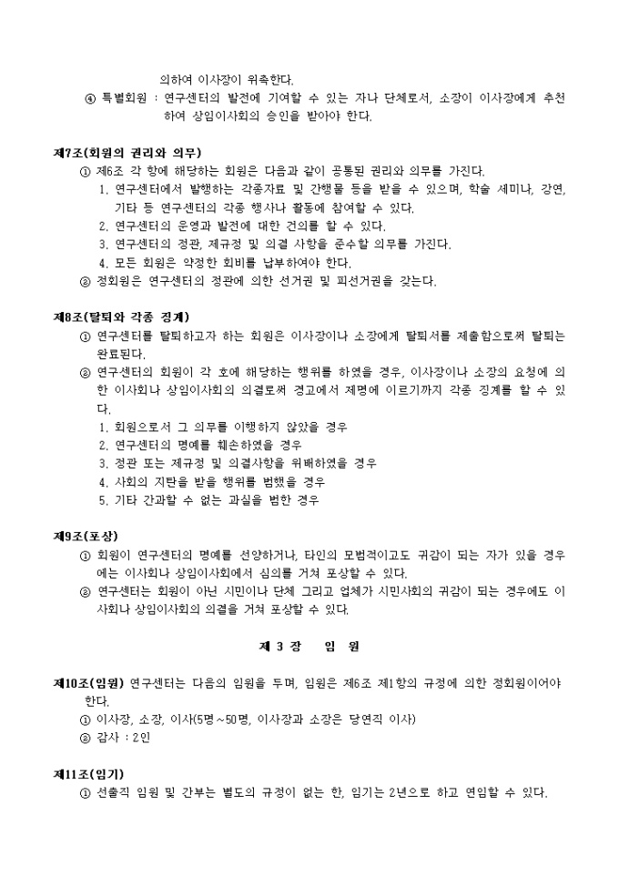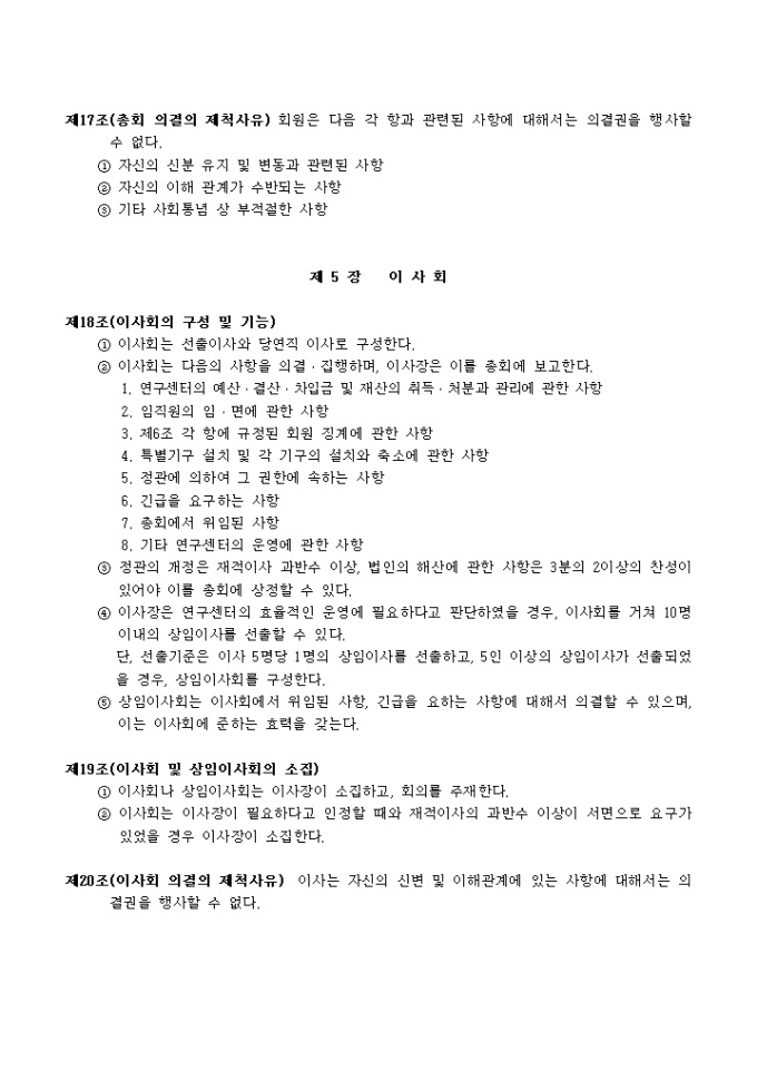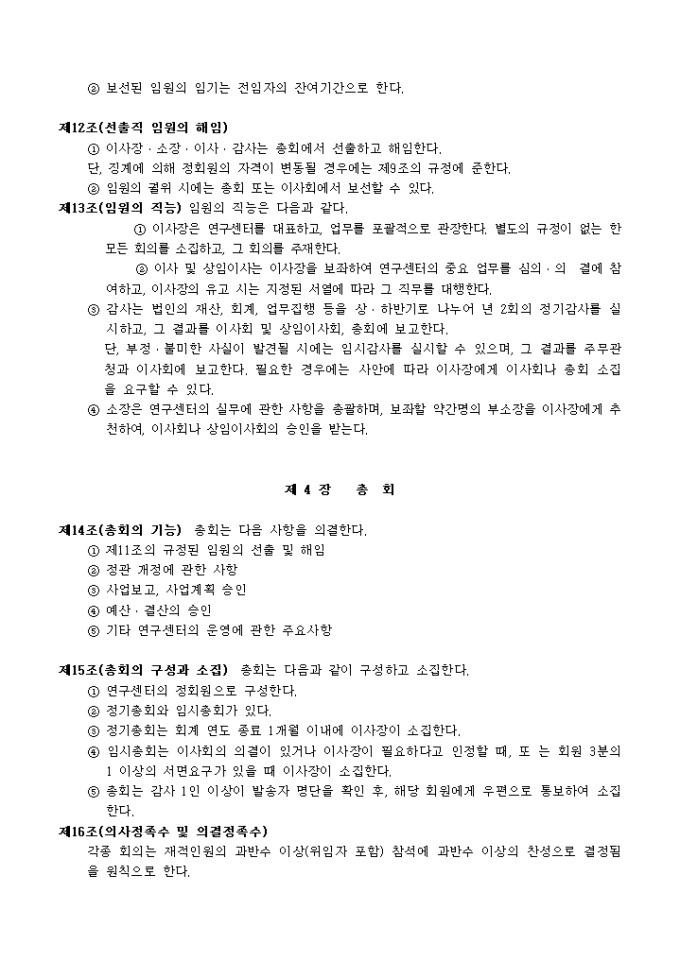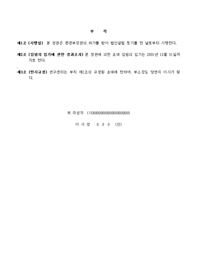 9,000원/월사단법인정관 예제 양식입니다. 제 1 장 총 칙 제1조(명칭) 본 연구센터는 사단법인 OOOO연구센터, 이하 연구센터라 한다.)라 칭한다. 제2조(소재지) 연구센터의 주 소재지는 경상남도 진주시에 둔다. ....