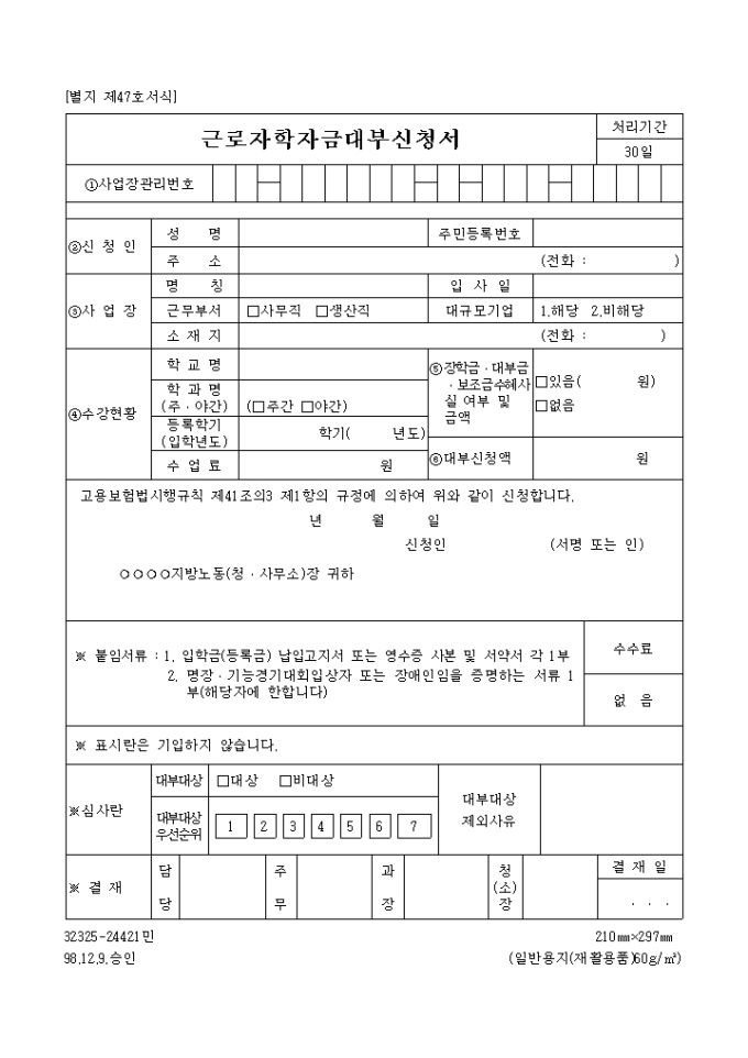 9,000원/월[별지제47호서식] 고용보험법시행규칙 제41조의3 제1항의 규정에 의하여 근로자 학자금 대부 신청할 때 사용하는 양식입니다.