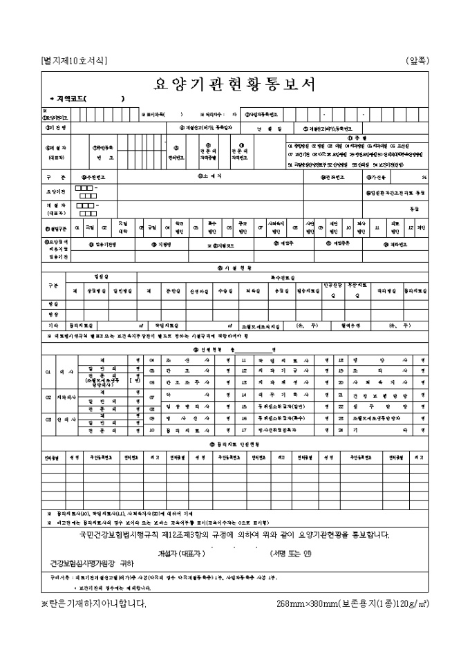 9,000원/월[별지제10호서식] 요양기관현황통보서 양식입니다. 국민건강보험법시행규칙 제12조제3항의 규정에 의하여 위와 같이 요양기관현황을 통보하실때 사용하는 양식입니다.