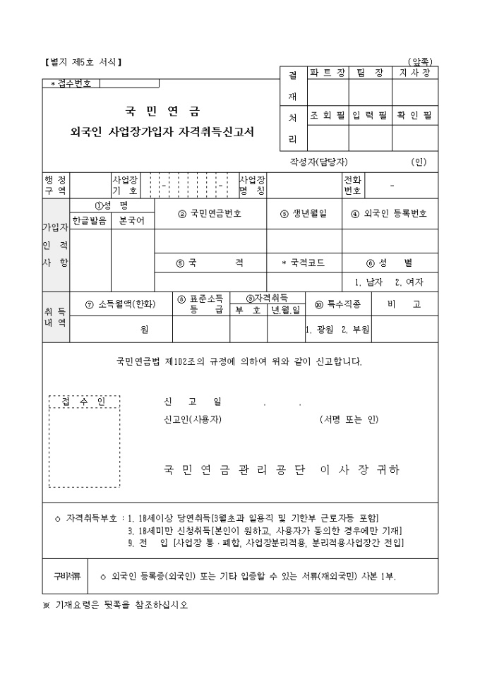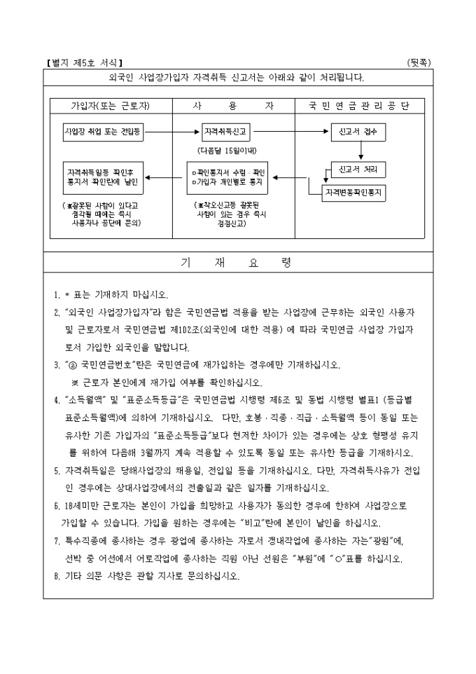 9,000원/월[별지 제5호 서식] 국민연금 외국인 사업장가입자 자격취득신고서 양식입니다. 국민연금법 제102조의 규정에 의하여 위와 같이 신고하실때 사용하는 양식입니다. 자격취득부호 : 1. 18세이상 당연취득[3월초과 일용직 및 기한부 근로자등 포함] 3. 18세미만 신청취득[본인이 원하고, 사용자가 동의한 경우에만 기재] 9. 전 입 [사업장 통·폐합, 사업장분리적용, 분리적용사업장간 전입]