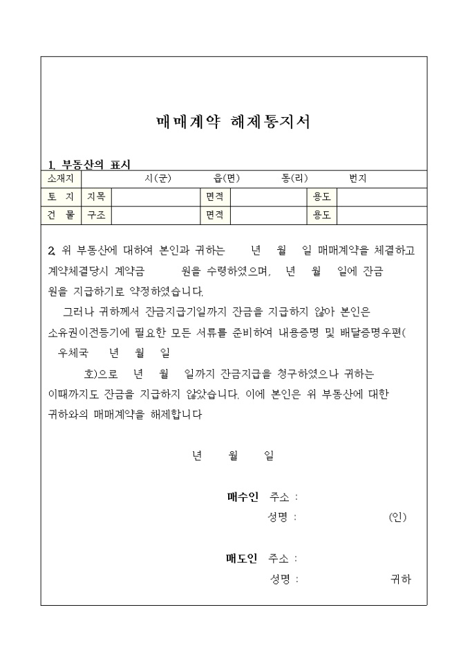 9,000원/월매매계약해제통지서 예제 양식입니다. 2. 위 부동산에 대하여 본인과 귀하는 년 월 일 매매계약을 체결하고 계약체결당시 계약금 원을 수령하였으며, 년 월 일에 잔금 원을 지급하기로 약정하였습니다. 그러나 귀하께서 잔금지급기일까지 잔금을 지급하지 않아 본인은 소유권이전등기에 필요한 모든 서류를 준비하여 내용증명 및 배달증명우편( 우체국 년 월 일 .....