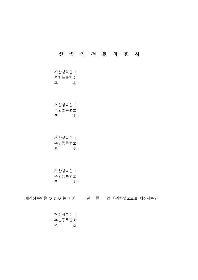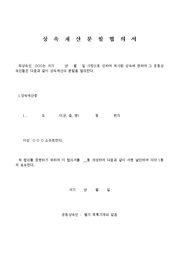 9,000원/월상속재산분할협의서 양식입니다. 피상속인 OOO는 서기 년 월 일 사망으로 인하여 개시된 상속에 관하여 그 공동상속인들은 다음과 같이 상속재산의 분할을 협의한다. 1.상속재산중 1 . 도 시(군, 읍, 면) 동 번지 ...