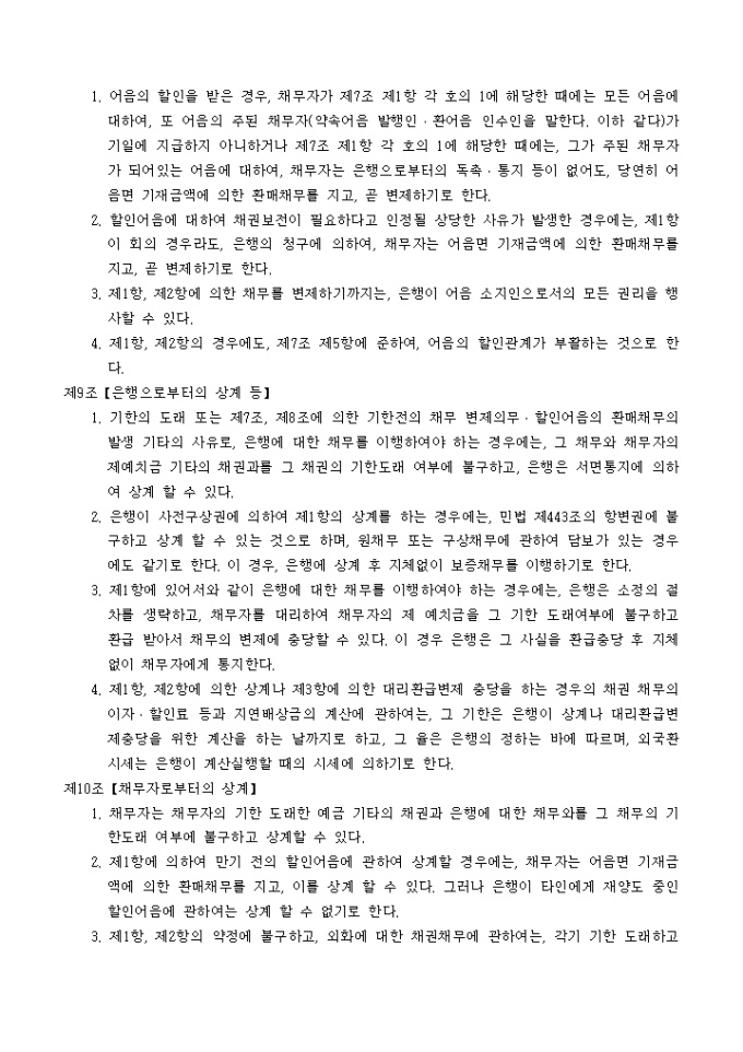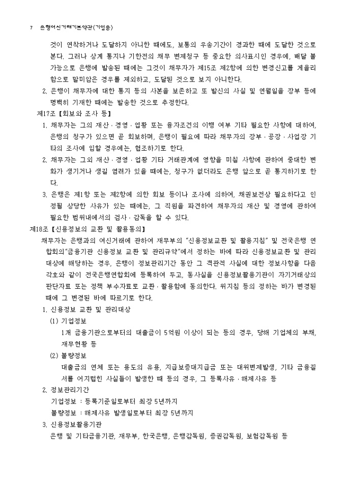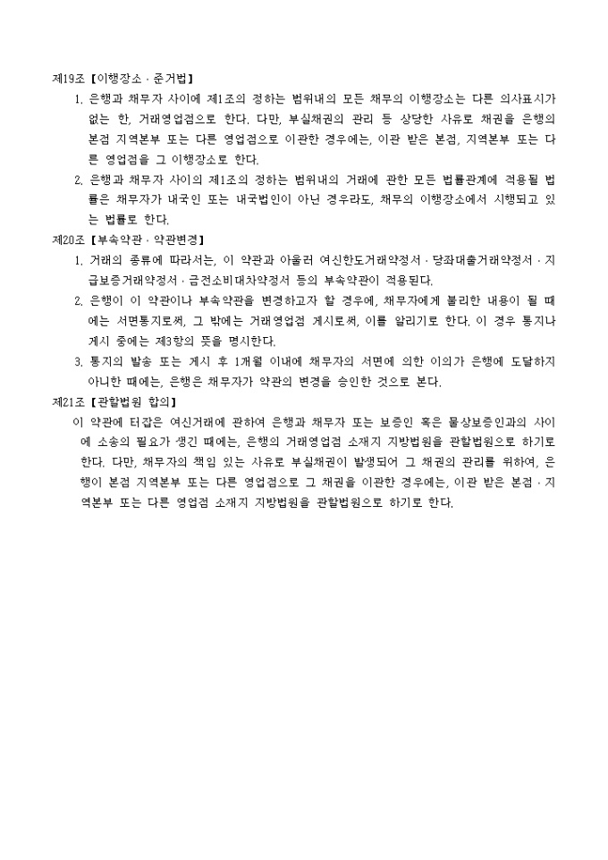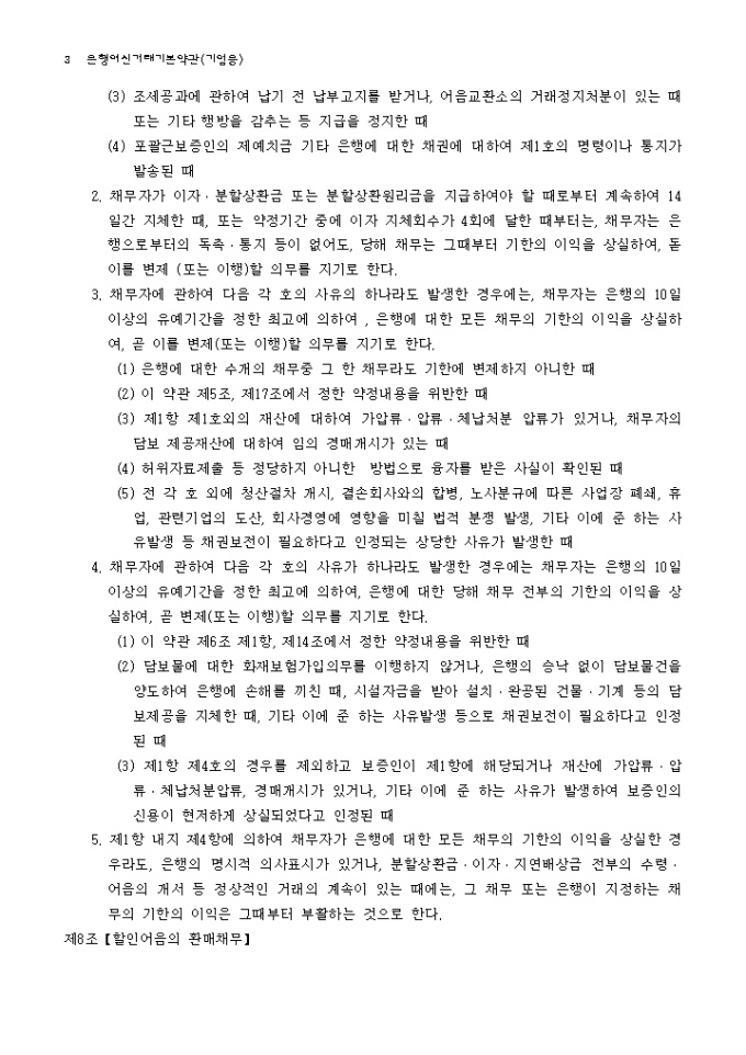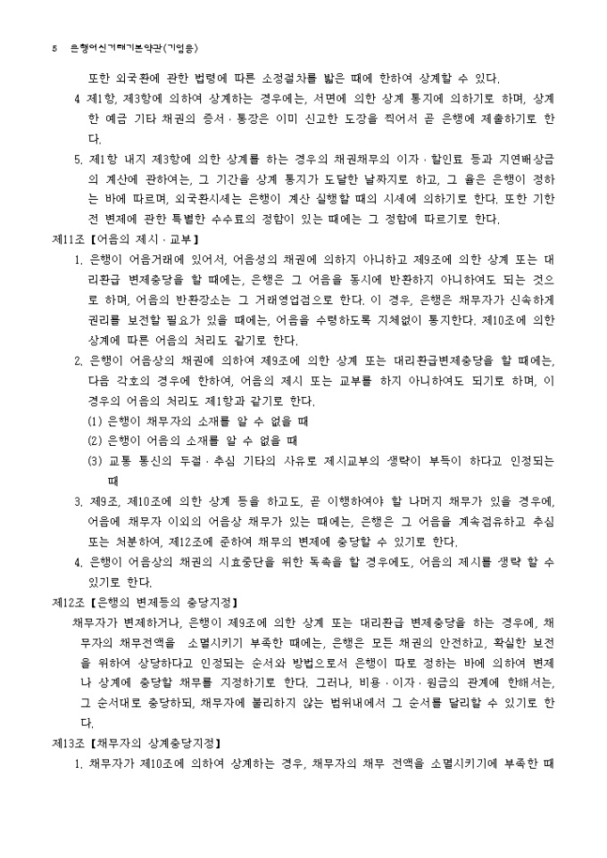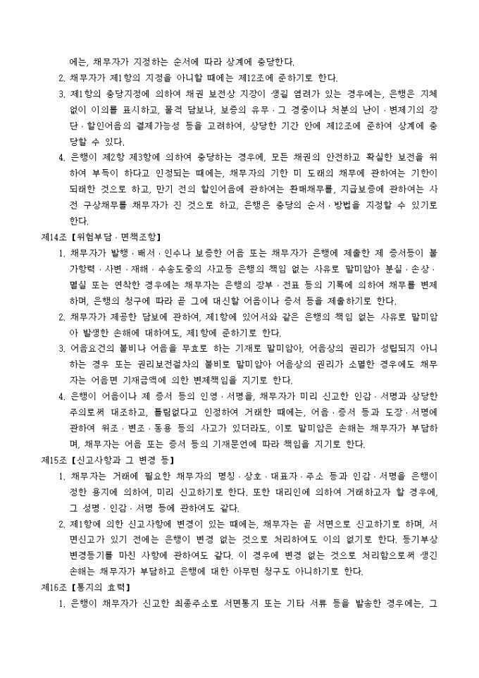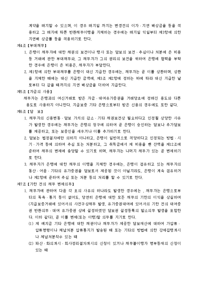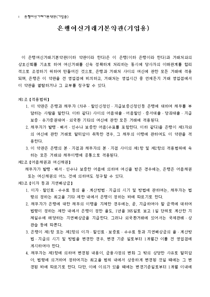 9,000원/월은행여신거래기본약관(기업용) 예제 양식입니다. 제1조[적용범위] 1. 이 약관은 은행과 채무자 (차주 할인신청인 지급보증신청인등 은행에 대하여 채무를 부담하는 사람을 말한다. 이하 같다) 사이의 어음대출 어음할인 증서대출 당좌대출 지급보증 유가증권대여 외국환 기타의 여신에 관한 모든 거래에 적용된다. 2. 채무자가 발행 배서 인수나 보증한