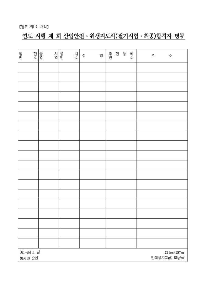 9,000원/월별표 제1호 서식 응시영역, 응시번호, 성명, 주민등록번호등으로 구성된 연도시행산업안전·위생지도사합격자명부(2000.12.22) 양식입니다.