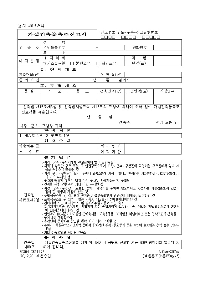 9,000원/월[별지 제8호서식] 가설건축물축조신고서 입니다. 건축법 제15조제2항 및 건축법시행규칙 제13조의 규정에 의하여 위와 같이 가설건축물축조신고서를 제출하실때 사용하는 양식입니다.