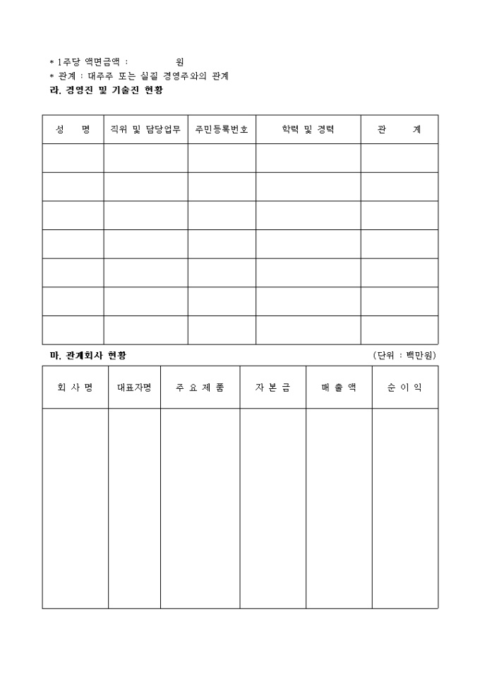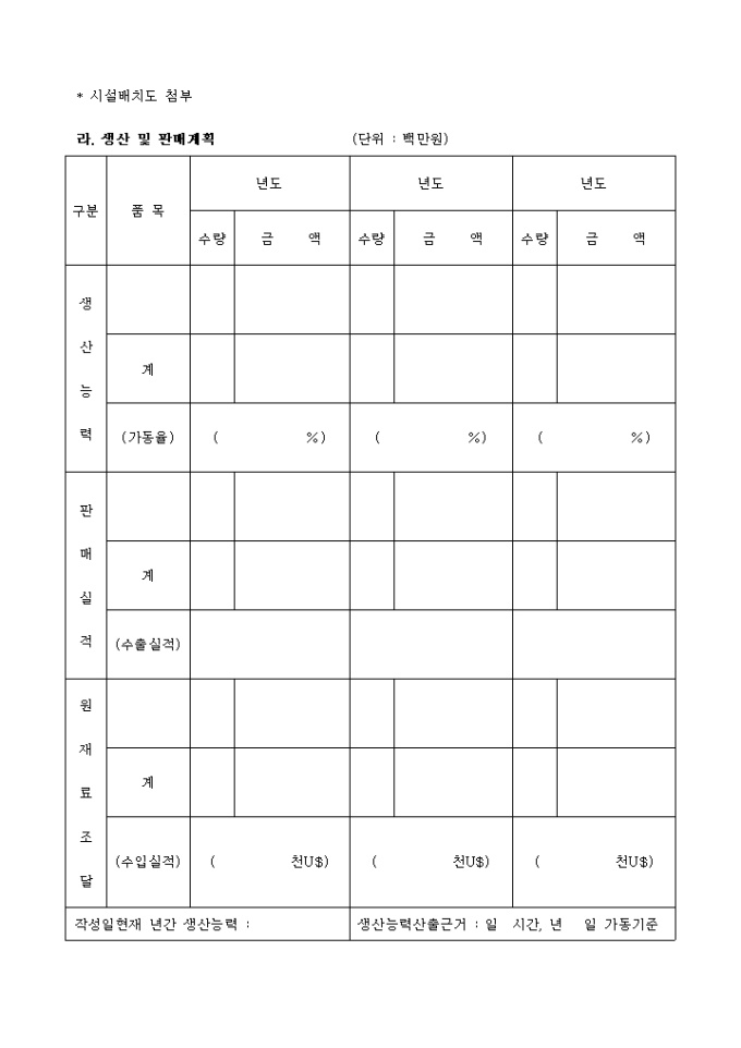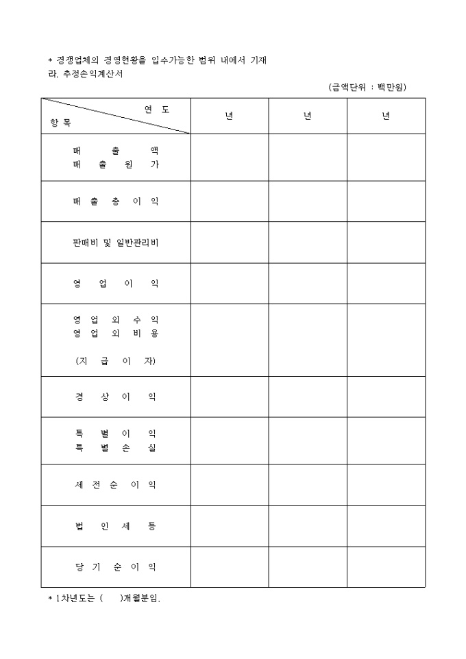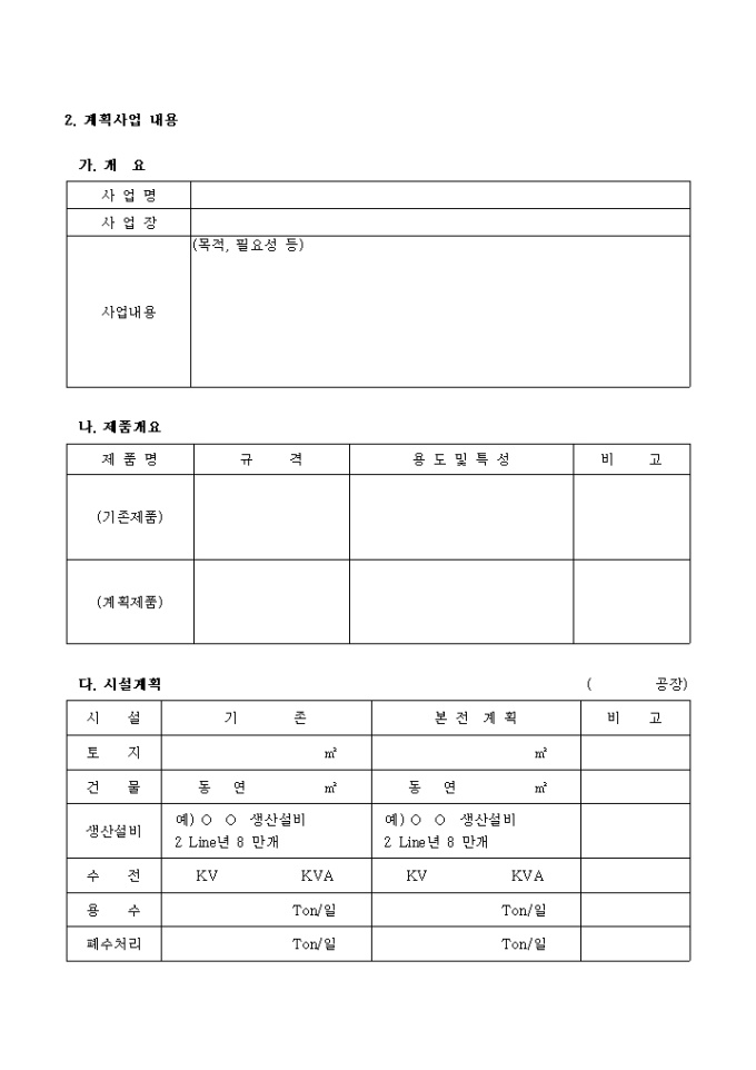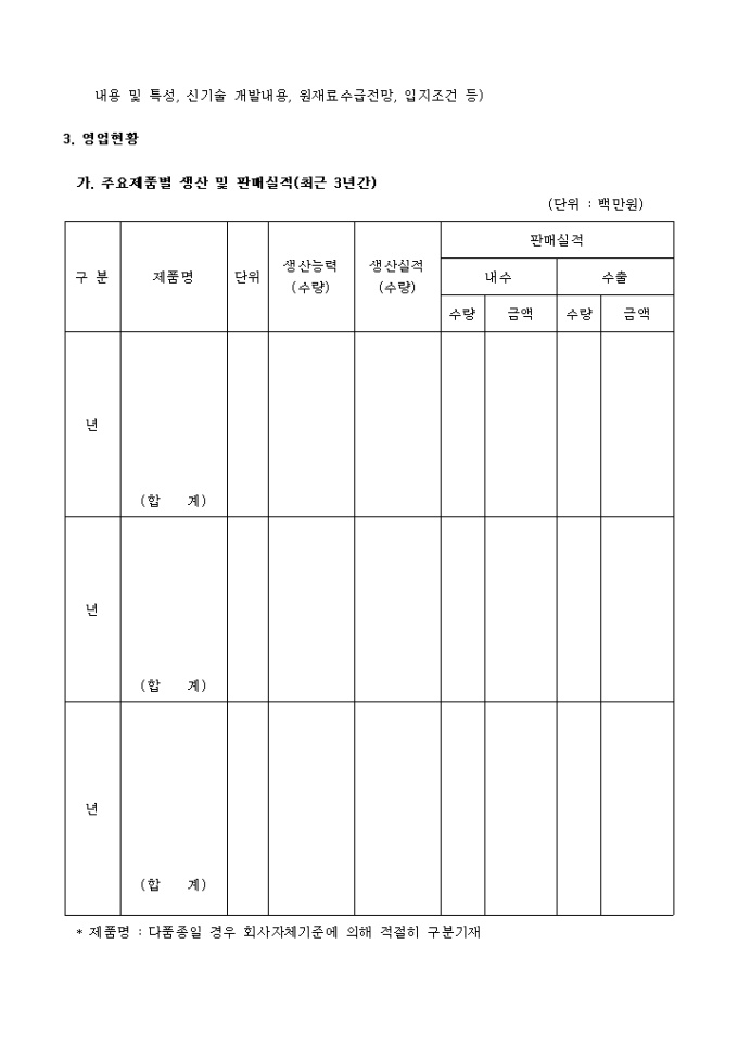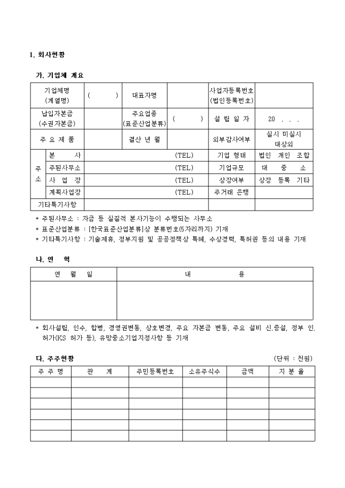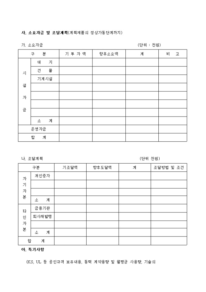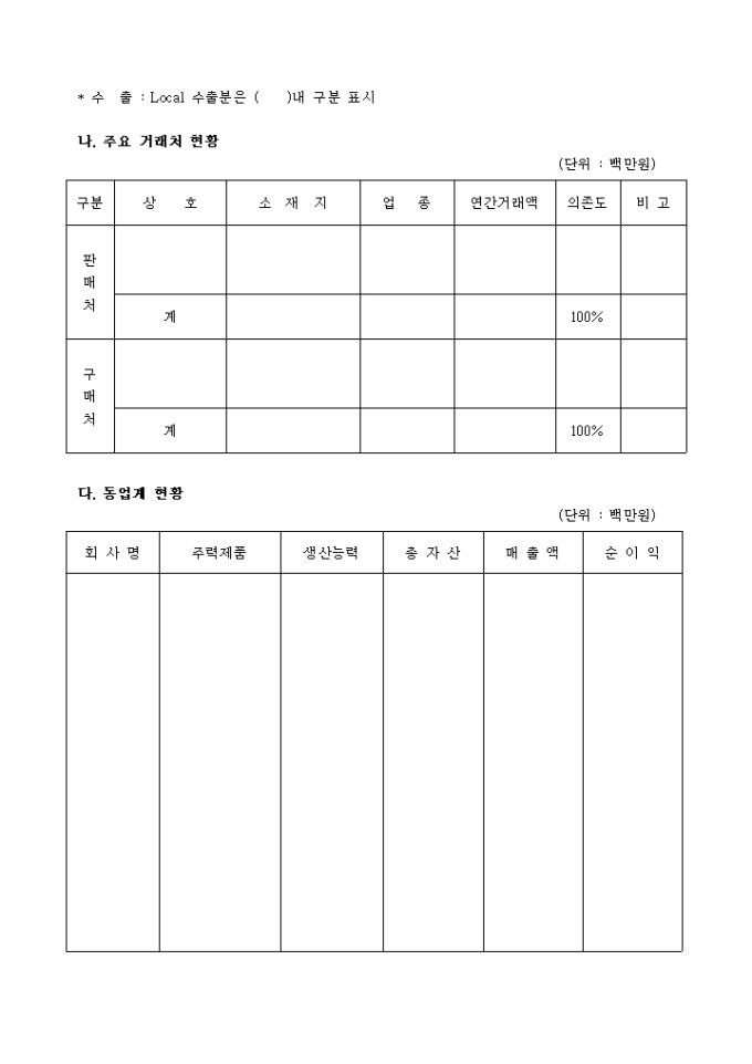 9,000원/월금융기관용 사업계획서 양식입니다. 1. 회사현황 가. 기업체 개요 나. 연 혁 다. 주주현황 라. 경영진 및 기술진 현황 마. 관계회사 현황 2. 계획사업 내용 가. 개 요 나. 제품개요 다. 시설계획 라. 생산 및 판매계획 마. 생산공정 바. 원 단위 표준 사. 소요자금 및 조달계획(계획제품의 정상가동단계까지) 아. 특기사항 3. 영업현황 가. 주요제품별 생산 및 판매실적(최근 3년간) 나. 주요 거래처 현황 다. 동업계 현황 라. 추정손익계산서 의 구성으로 이루어져 있습니다.