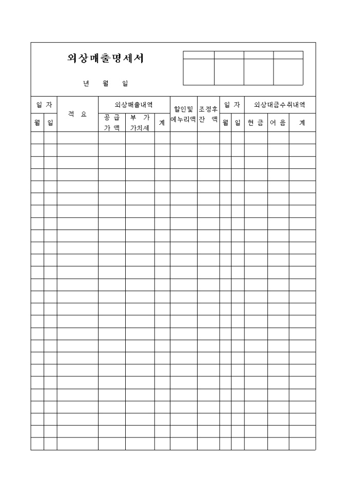 9,000원/월일별 외상매출 내역 및 외상대금수취내역을 정리 관리하는 외상매출명세서 양식입니다.