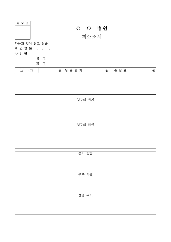 9,000원/월[부록 제1호] 제소조서(소액사건심판규칙) 입니다. 청구의 취지,청구의 원인,증거방법,부속서류,법원주사의 항목으로 구성된 양식입니다.