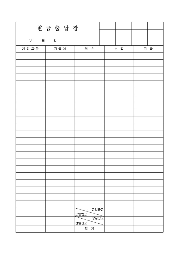 9,000원/월지불처, 적요, 수입, 지출을 기록하는 현금출납장 양식입니다.