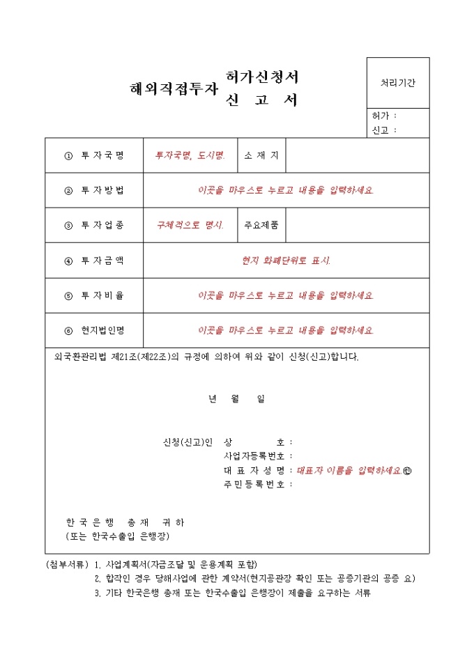 9,000원/월해외직접투자허가신청서,신고서 양식입니다. 외국환관리법 제21조(제22조)의 규정에 의하여 위와 같이 신청(신고)때 사용하시는 양식입니다.