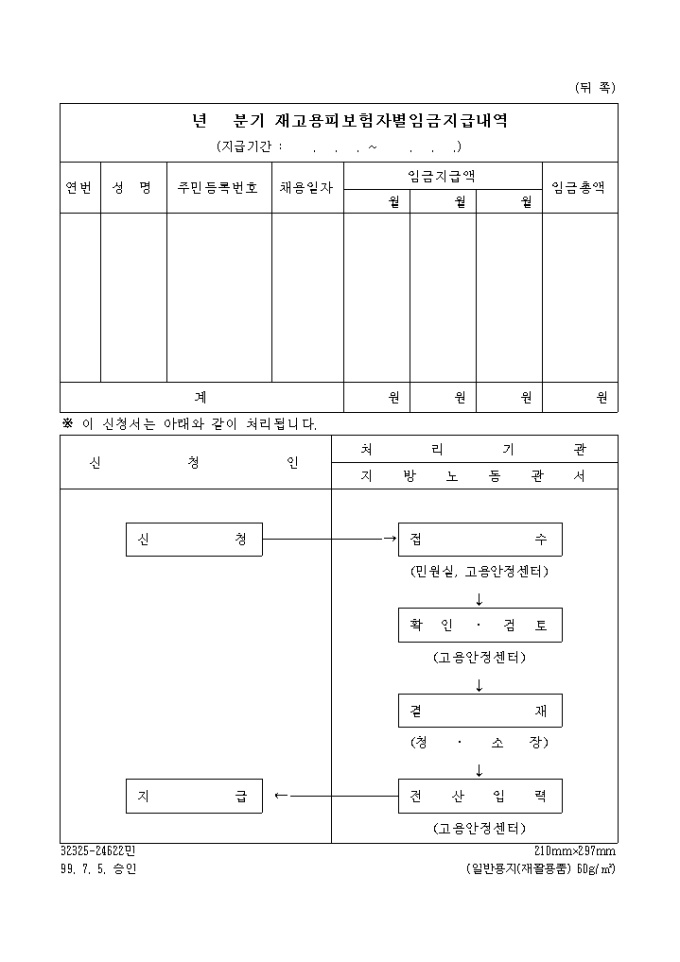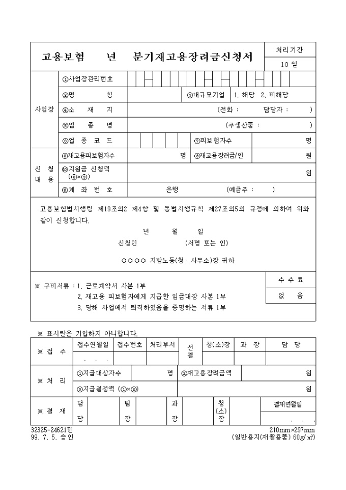 9,000원/월[별지제30호의4서식] 고용보험법시행령 제19조의2 제4항 및 동법시행규칙 제27조의5의 규정에 의하여 재고용 장려금을 신청할 때 사용하는 양식입니다. 분기별 재고용피보험자별임금지급내역 도 첨부되어 있습니다.