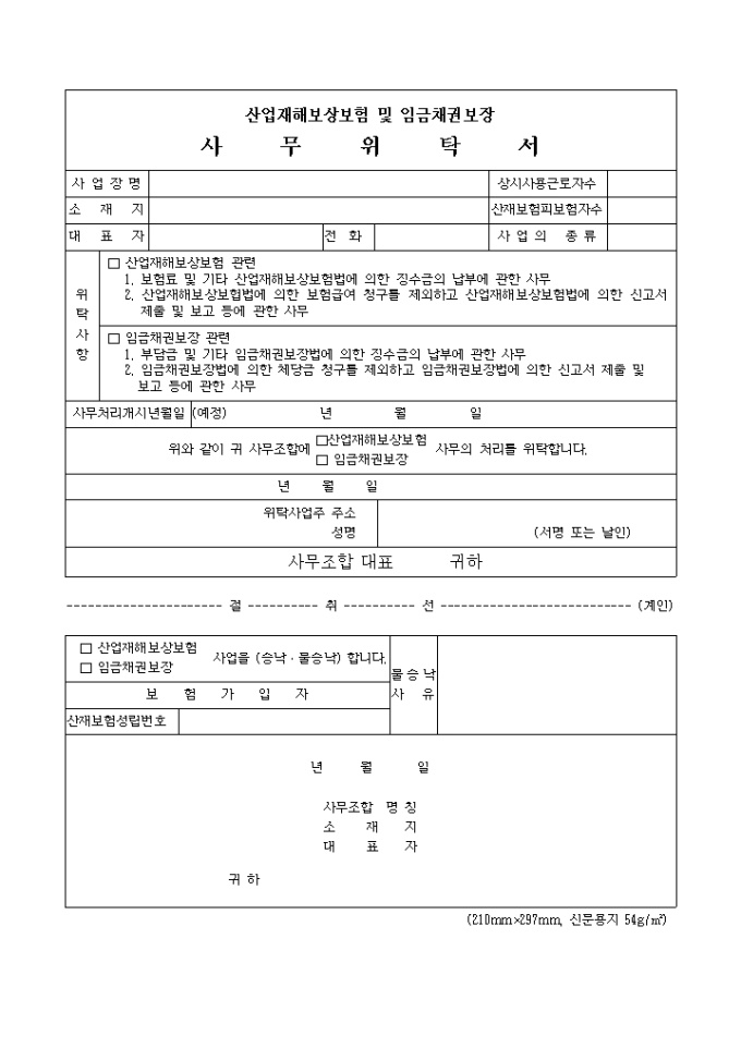 9,000원/월[별지 제59호 서식] 산업재해보상보험 및 임금채권보장 사무위탁서 양식입니다. [위탁사항] 산업재해보상보험 관련 1. 보험료 및 기타 산업재해보상보험법에 의한 징수금의 납부에 관한 사무 2. 산업재해보상보헙법에 의한 보험급여 청구를 제외하고 산업재해보상보험법에 의한 신고서 제출 및 보고 등에 관한 사무 임금채권보장 관련 1. 부담금 및 기타 임금채권보장법에 의한 징수금의 납부에 관한 사무 2. 임금채권보장법에 의한 체당금 청구를 제외