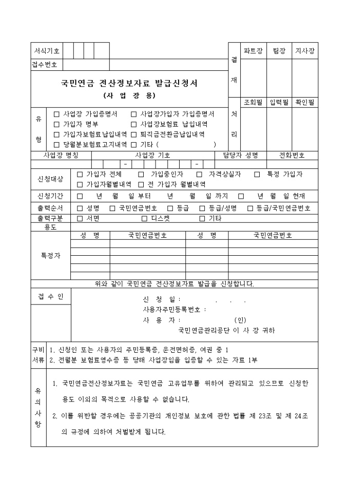 9,000원/월국민연금 전산정보자료 발급신청서 양식입니다.(가입자용) [구비서류] 1. 본인신청시 : 주민등록증, 운전면허증, 여권 중 1 2. 배우자 등 가족신청시 : 신청인의 주민등록증, 운전면허증, 여권 중 1 신청인의 주민등록등본(발급대상자와 같이 등재된 것) 1부 3. 대리인 또는 우편청구시 : 발급대상자의 인감증명서 1부 발급대상자의 인감도장 (우편청구시 신청인란에 날인) 대리인의 주민등록증, 운전면허증, 여권 중 1