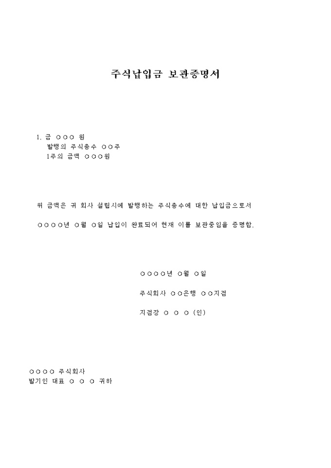 9,000원/월명시한 금액이 회사 설립시에 발행하는 주식총수에 대한 납입금으로서 특정일까지 납입이 완료되어 현재 이를 보관중임을 증명하는 양식입니다.