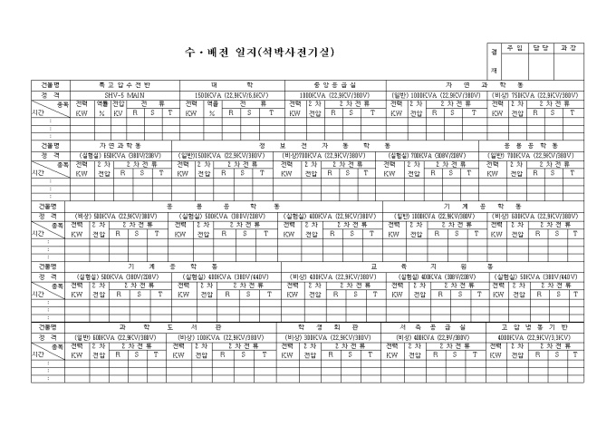 9,000원/월건물별 전력, 역률, 전압, 전류를 기록하는 양식입니다.