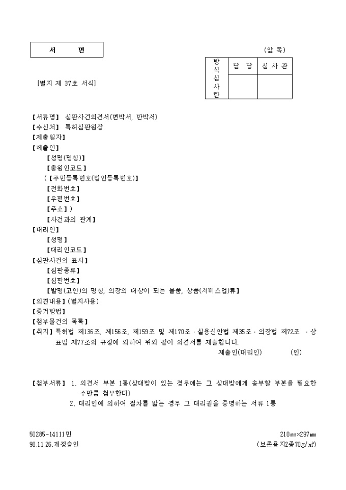 9,000원/월심판사건 의견서(변박서,반박서) 양식 예제입니다. 【대리인】 【성명】 【대리인코드】 【심판사건의 표시】 【심판종류】 【심판번호】 【발명(고안)의 명칭, 의장의 대상이 되는 물품, 상품(서비스업)류】 【의견내용】(별지사용) 【증거방법】 【첨부물건의 목록】 【취지】특허법 제136조, 제156조, 제159조 및 제170조․실용신안법 제35조․의장법 제72조 ․상표법 제77조의 규정에 의하여 위와 같이 의견서를 제출합니다. 제출인(대리인) (인) 【첨부서류】 1. 의견서 부본 1통(상대방이 있는 경우에는 그 상대방에게 송부할 부본을 필요한 수만큼 첨부한다) 2. 대리인에 의하여 절차를 밟는 경우 그 대리권을 증명하는 서류 1통