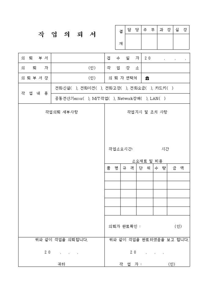 9,000원/월작업의뢰 세부사항, 작업지시 및 조치 사항을 기록하는 작업의뢰서입니다.