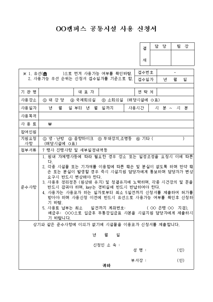 9,000원/월기관명, 사용장소, 사용일자, 사용목적, 사용료, 참여인원, 지원요청사항 등을 기록하는 OO캠퍼스공통시설사용신청서입니다.