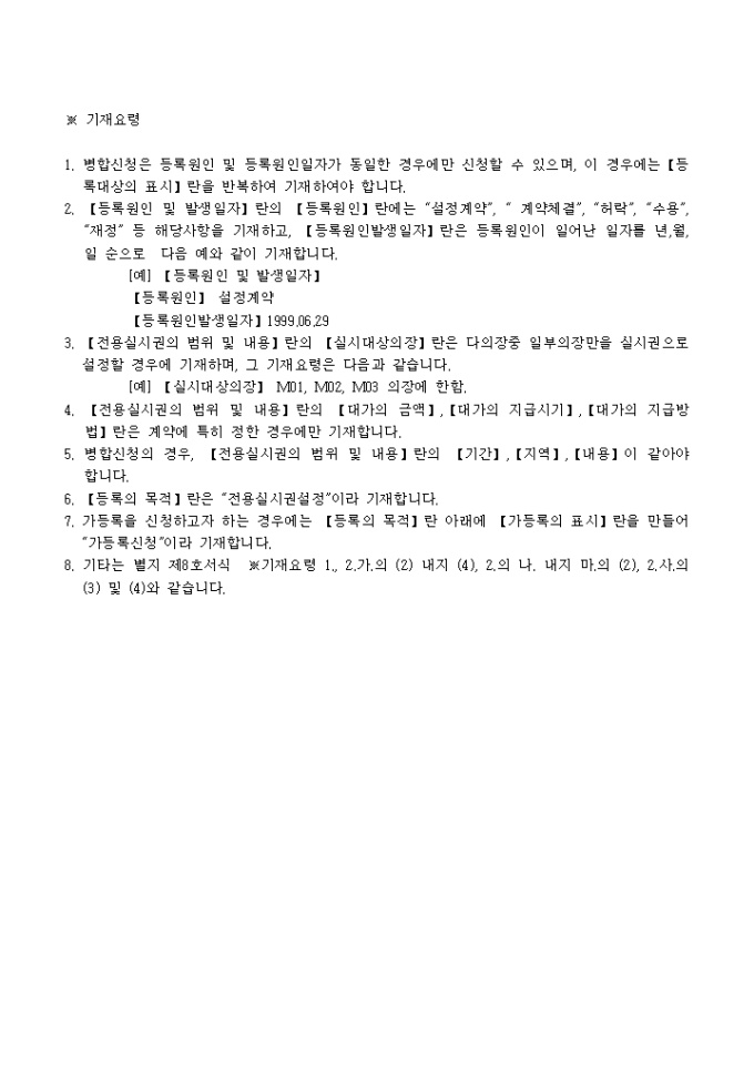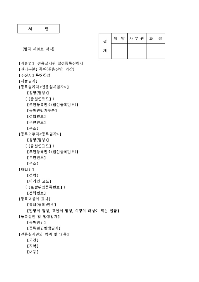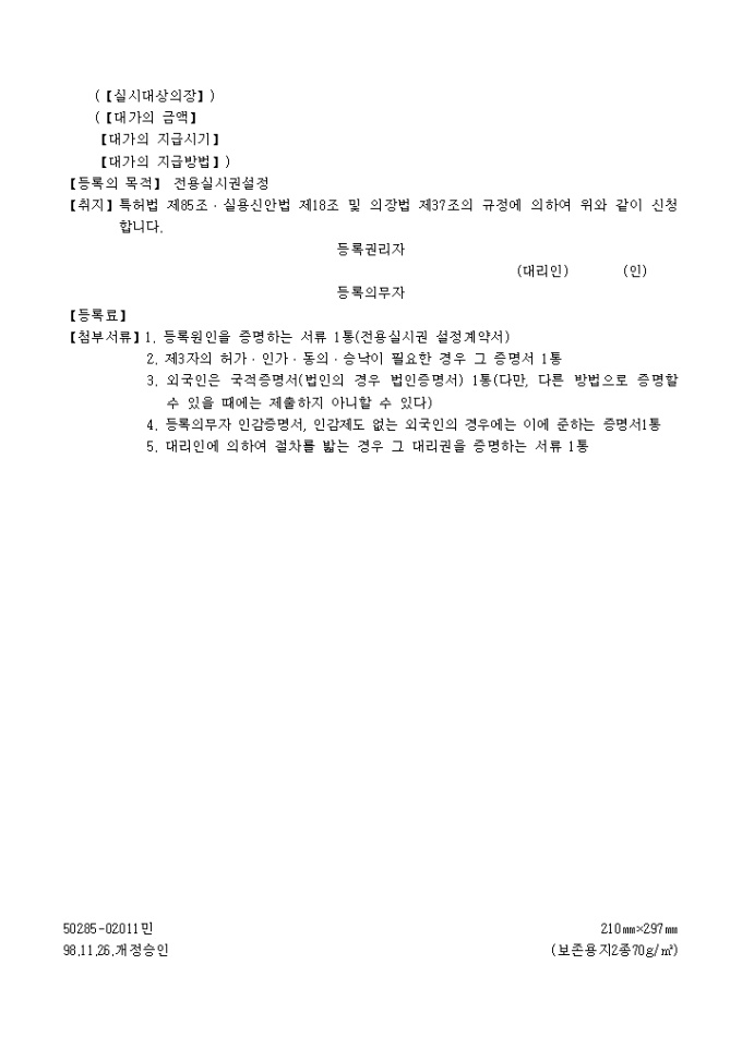 9,000원/월전용 실시권 설정 등록신청서 양식 예제입니다. [등록의 목적] 전용실시권설정 [취지]특허법 제85조 실용신안법 제18조 및 의장법 제37조의 규정에 의하여 위와 같이 신청합니다. 등록권리자 (대리인) (인) 등록의무자 [등록료] [첨부서류]1. 등록원인을 증명하는 서류 1통(전용실시권 설정계약서) 2. 제3자의 허가 인가 동의 승낙이 필요한 경우 그 증명서 1통 3. 외국인