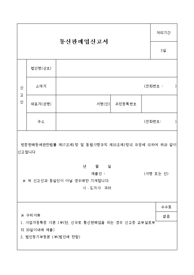 9,000원/월통신 판매업 신고서 양식입니다. 방문판매등에관한법률 제17조제1항 및 동법시행규칙 제10조제1항의 규정에 의하여 위와 같이 신고합니다 구비서류가 명시되어 있습니다