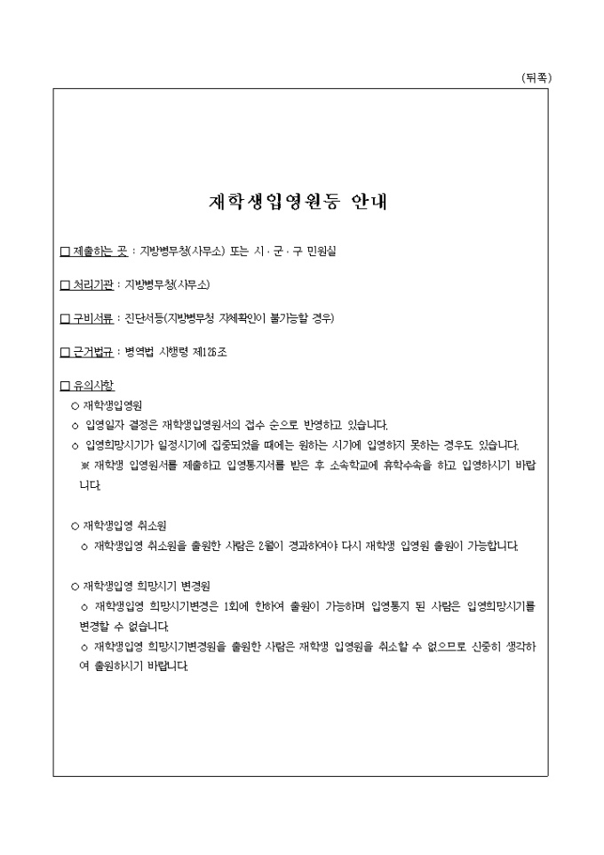 9,000원/월재학생 입영(취소,희망시기변경)원서 양식 예제입니다. 병역법시행령 제126조 규정에 의하여 위와 같이 재학생입영(취소, 희망시기변경)원서를 제출합니다. 년 월 일 신청인 : (서명 또는 인) 병역의무자와의 관계 : 지방병무청(사무소)장 귀하