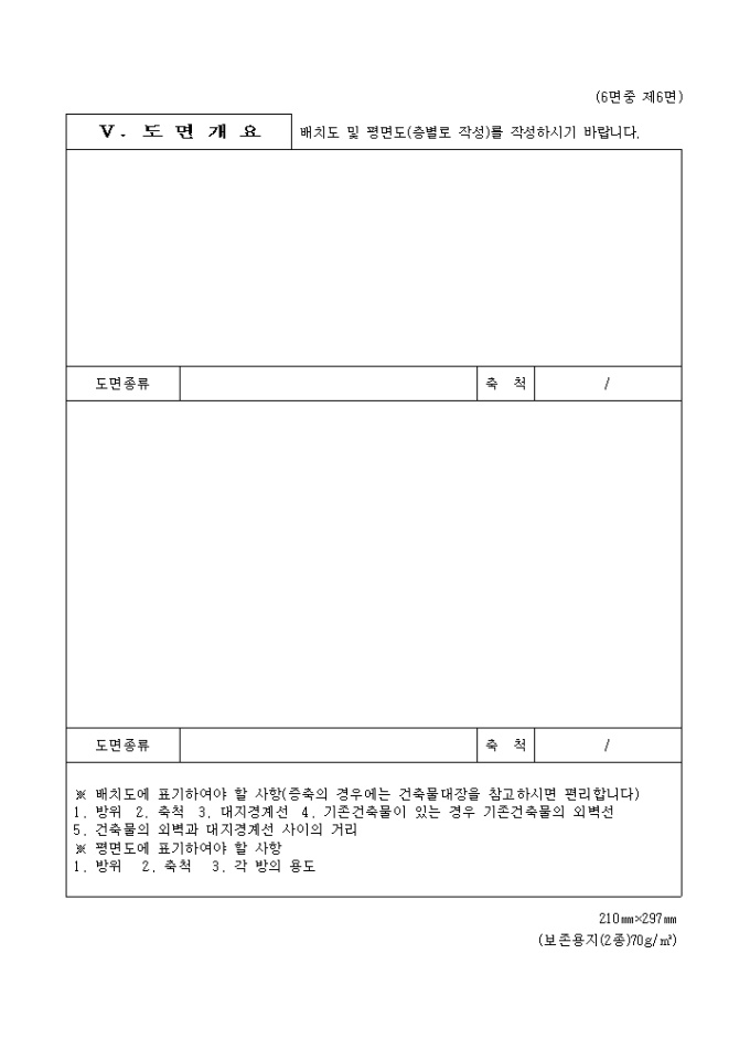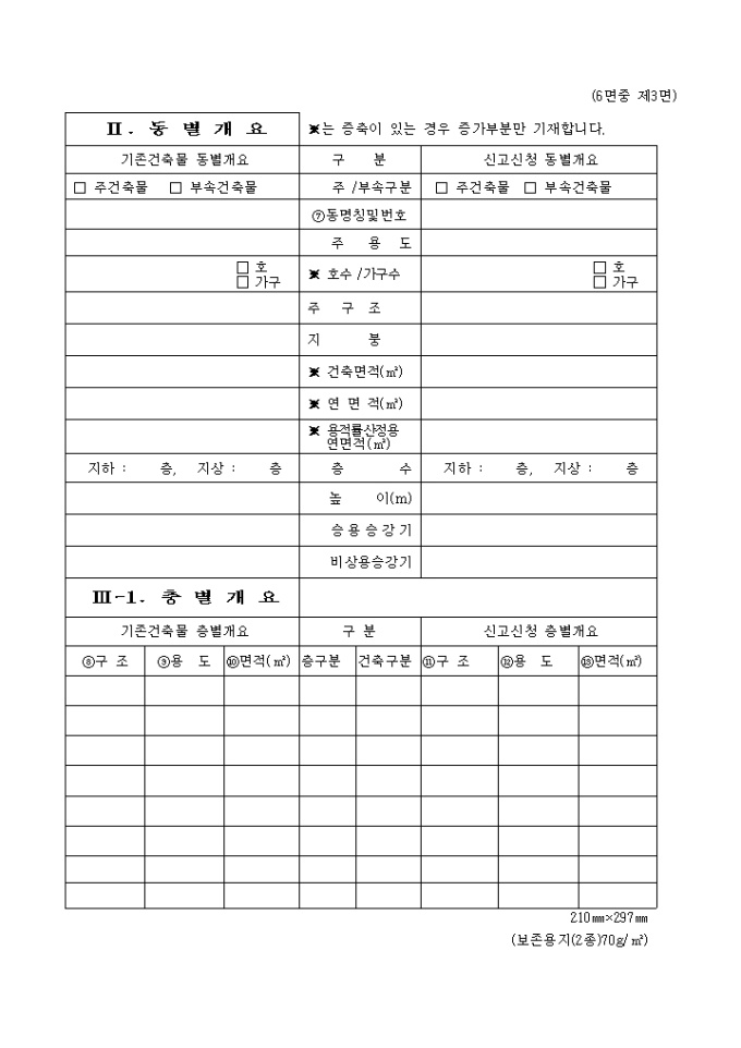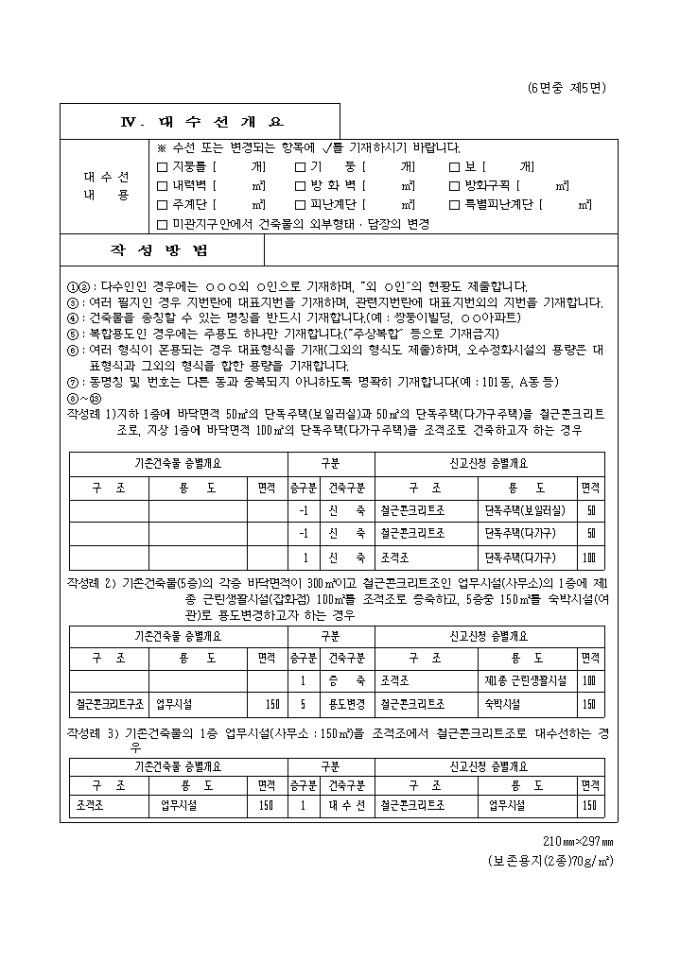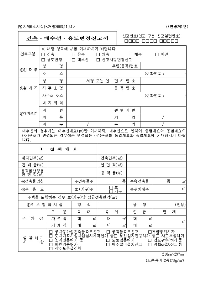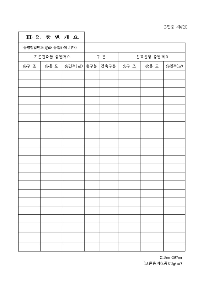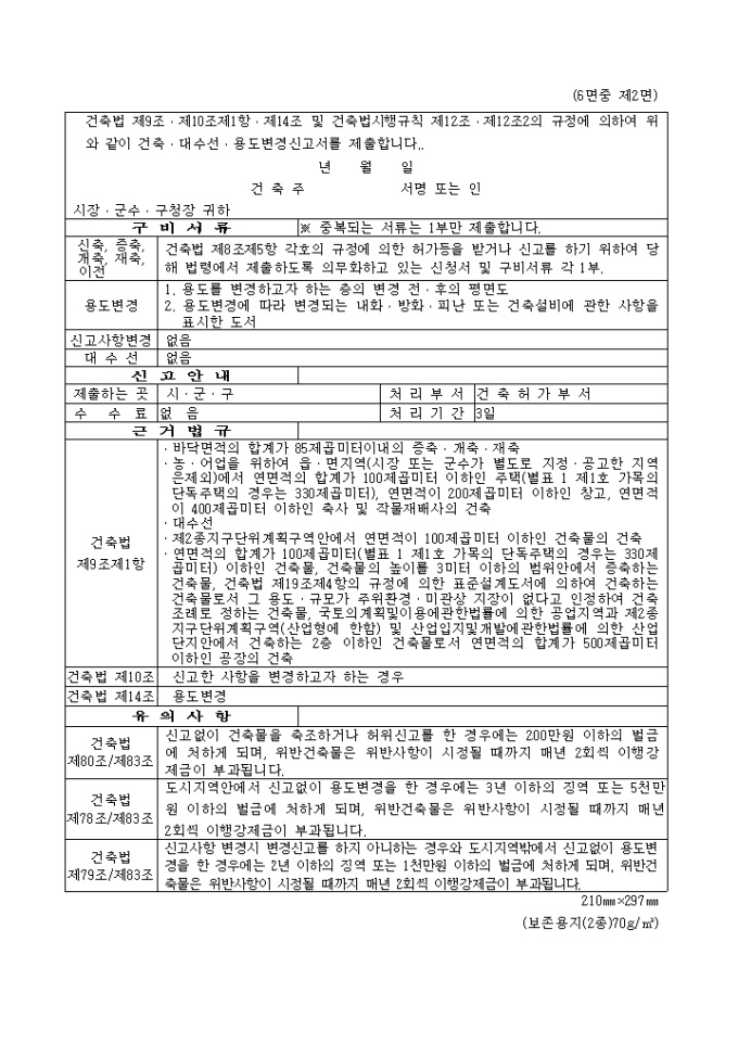 9,000원/월건축법 제9조․제10조제1항․제14조 및 건축법시행규칙 제12조․제12조2의 규정에 의하여 위와 같이 건축․대수선․용도변경신고를 하고자 할 때 사용하는 '건축물 용도변경 신고서' 양식입니다.
