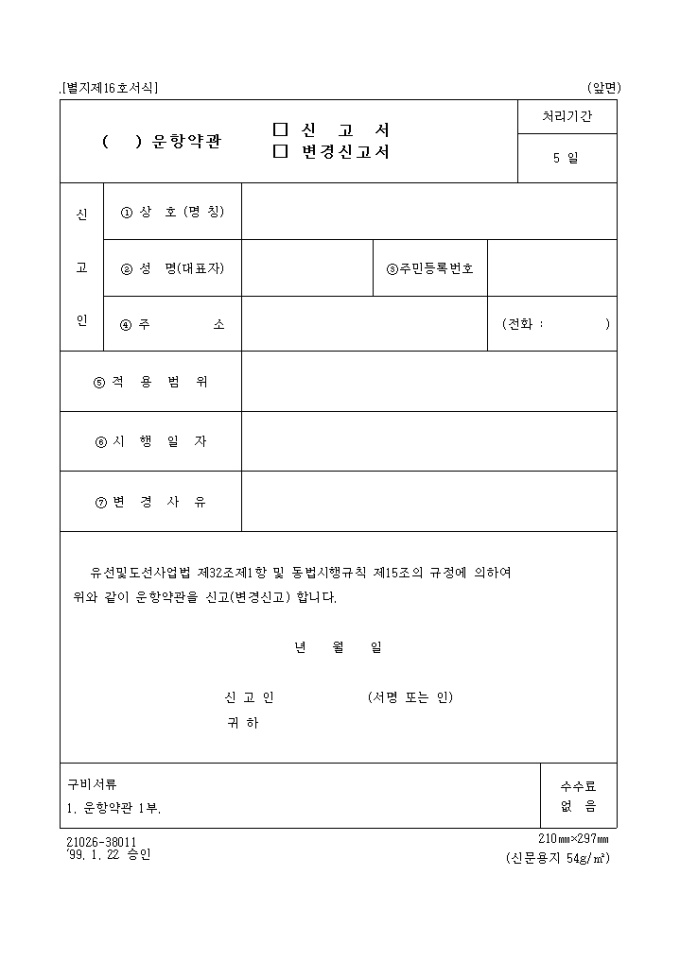9,000원/월유선및도선사업법 제32조제1항 및 동법시행규칙 제15조의 규정에 의하여 위와 같이 운항약관을 신고(변경신고)하고자 할 때 사용하는 '유선 및 도선사업 운항약관 신고(변경신고)' 양식입니다.
