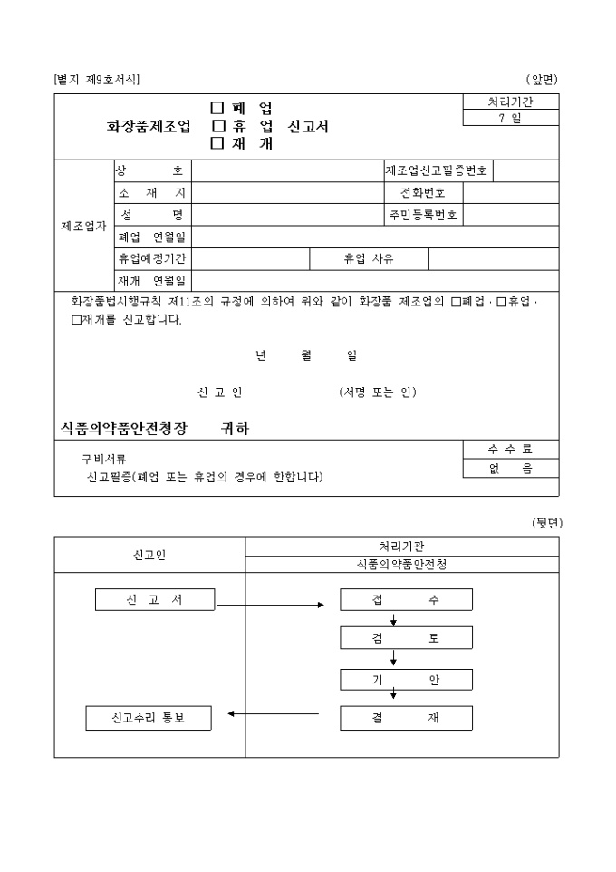 9,000원/월화장품법시행규칙 제11조의 규정에 의하여 위와 같이 화장품 제조업의 □폐업․□휴업․□재개를 신고하고자 할 때 사용하는 '화장품 제조업 (폐업,휴업,재개)신고서' 양식입니다.