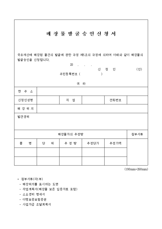 9,000원/월국유재산에 매장된 물건의 발굴에 관한 규정 제5조의 규정에 의하여 매장물의 발굴승인을 신청하고자 할 때 사용하는 매장물 발굴 승인신청서 양식입니다.