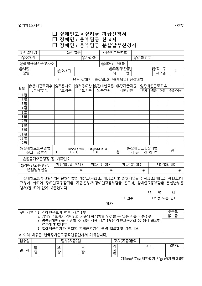 9,000원/월장애인고용촉진 및 직업재활법시행령 제27조(제28조, 제30조) 및 동법시행규칙 제10조(제11조, 제13조)의 규정에 의하여 장애인고용장려금 지급신청서(장애인고용부담금 신고서, 장애인고용부담금 분할납부신청서)를 위와 같이 제출할 때 사용하는 장애인 고용장려금 지급신청서 양식입니다.