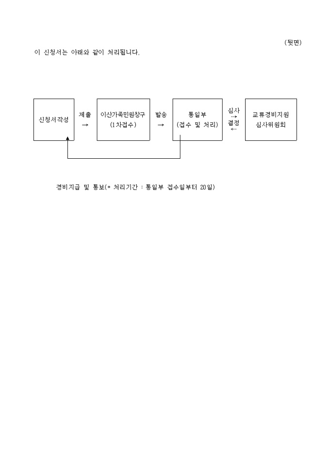 9,000원/월위 기재사항이 사실과 다름이 없으며, 기재사실이 허위로 밝혀질 경우에는 지원금 반환 등 허위사실 기재에 따른 모든 책임을 질 것을 서약할 조건하에 이산가족 상봉 지원금을 신청하고자 할 때 사용하는 이산가족 상봉지원금 신청서 양식입니다.