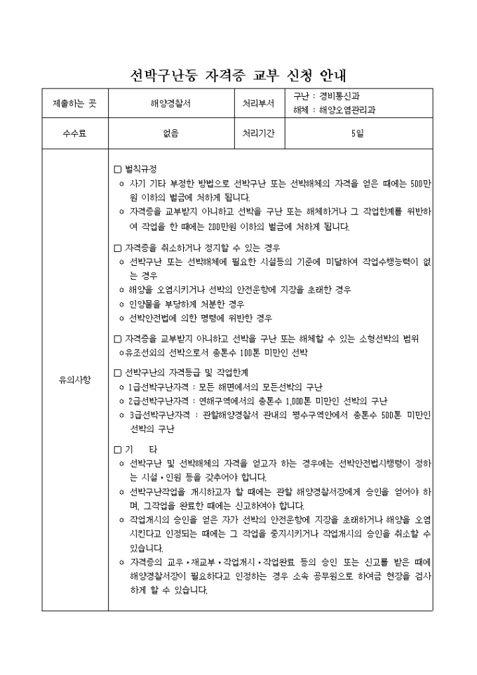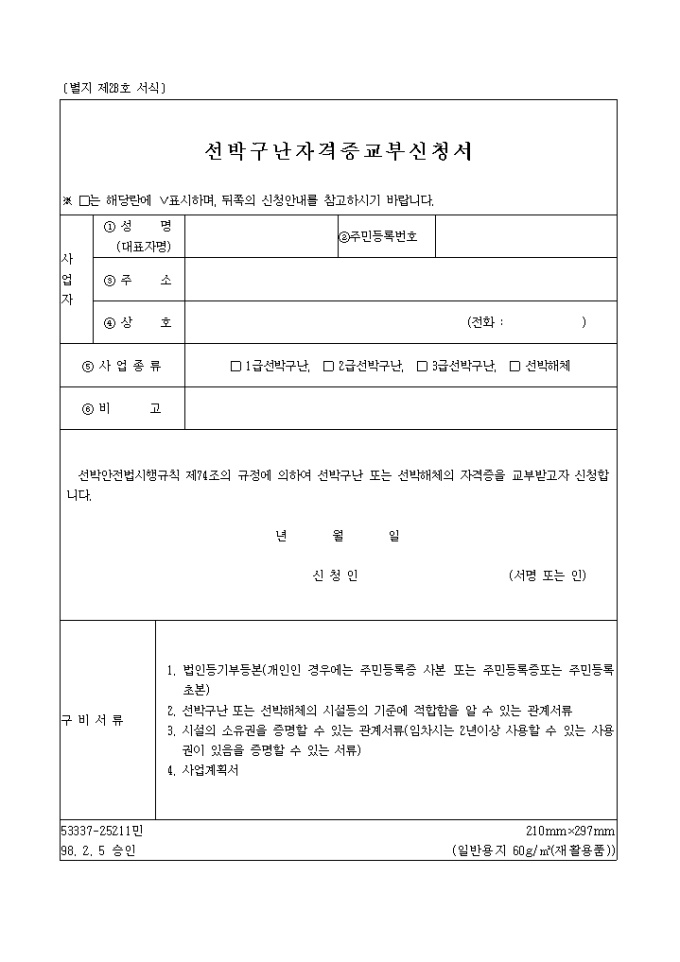 9,000원/월선박안전법시행규칙 제74조의 규정에 의하여 선박구난 또는 선박해체의 자격증을 교부받고자 신청할 때 사용하는 '선박구난 자격증 교부신청서' 양식입니다.