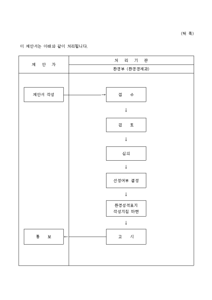환경기술개발 및 지원에 관한 법률 제23조 제1항, 동법시행령 제26조 제1항 및 동법시행규칙 제39조의 규정에 의하여 환경성적표지대상제품의 선정을 제안할 때 사용하는 '환경성적 표지 대상제품 선정제안서' 양식입니다.