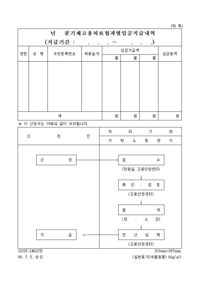 9,000원/월고용보험법시행령 제19조의2제4항 및 동법시행규칙 제27조의5의 규정에 의하여 위와 같이 신청하고자 할 때 사용하는 '재고용장려금 신청서' 양식입니다.