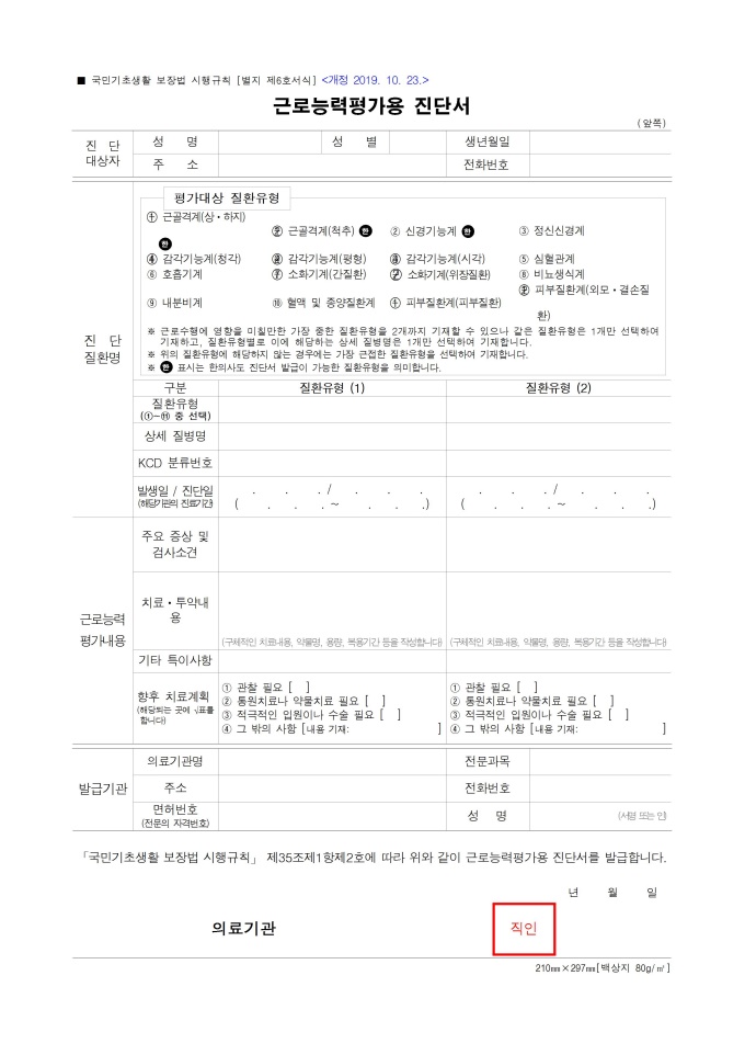 9,000원/월국민기초생활 보장법 시행규칙 [시행 2015.7.1.] [보건복지부령 제309호, 2015.4.20., 일부개정]의 [서식 6] 근로능력평가용 진단서 별표/서식 및 양식 입니다.